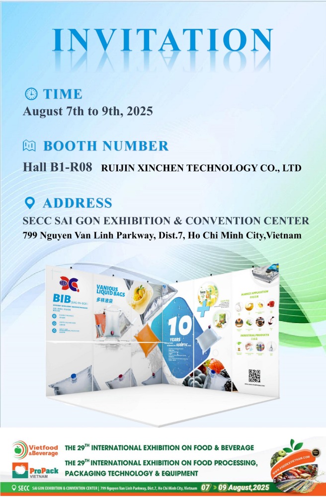 С 7 по 9 августа 2025 года Ruijin Xinchen Technology Co., Ltd. примет участие в выставке «Продовольственная, напитки и упаковочная выставка» в городе Хо Ши Мин, Вьетнам, на стенде B1 R08. На выставке будут представлены последние решения для асептической упаковки компании и технологии BIB Bag, привлекая многочисленных специалистов отрасли для посещения и обсуждения бизнеса.